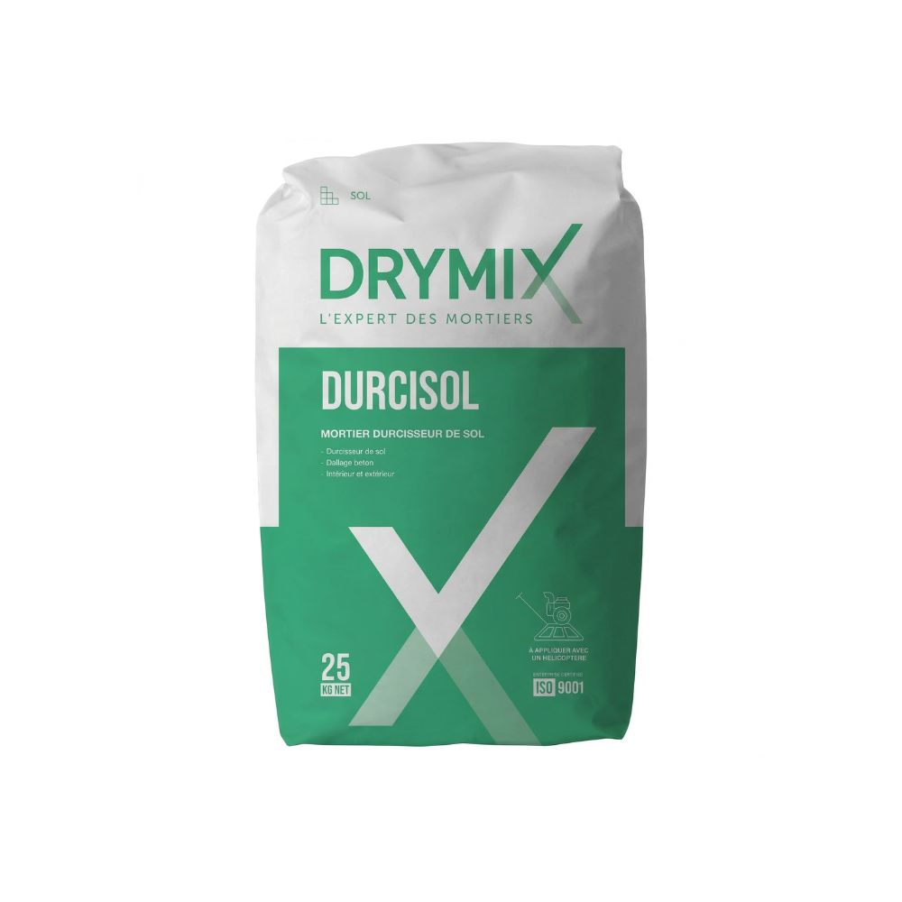 Drymix Durcisol is a pre-packed non-metallic floor hardener dry-sprinkled onto fresh concrete slabs to dramatically increase abrasion and impact resistance. Unlike metallic hardeners, it will not rust or stain. Forms a monolithic bond with the concrete base. Validated by the CSTB (Centre Scientifique et Technique du Bâtiment, France), tested per EN 13892, ISO 9001 certified.